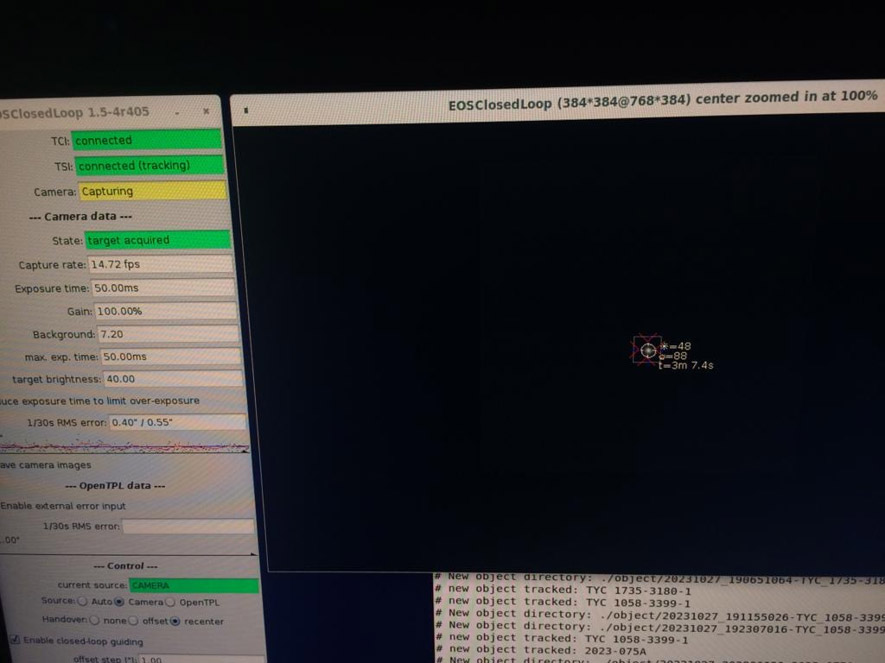 Fin octobre 2023 la station sol FEELINGS* (pour Feeder Links Ground Station) a reçu un élément clé, le télescope de 60 cm fourni par la société Astelco, dotant l’ONERA d’une capacité de poursuite de satellites de précision optique jusqu’aux orbites basses. Le télescope a démontré une capacité de pointage absolue meilleure qu’une seconde d’arc, offrant la possibilité d’un suivi de satellite de précision métrique en boucle ouverte. La capacité de pointage du satellite géostationnaire BADR8 emportant la charge utile TELEO avec laquelle FEELINGS effectuera ses premiers liens optiques au printemps 2024, a été démontrée (cf. illustration).