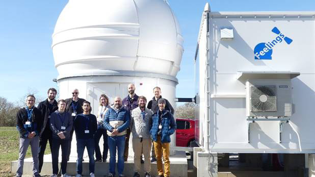 Jeudi 28 mars dernier, en fin de journée, la station sol FEELINGS a émis ses premiers photons infrarouges vers le satellite géostationnaire BADR-8 et sa charge utile TELEO. Elaborée par ADS et cofinancée par le CNES ; TELEO est dédiée aux télécommunications optiques. Cette première phase consiste en un test permettant de s’assurer de la qualité de pointage respective de la station et du satellite. La lumière émise par la balise de la station a parcouru sans encombre les 40 000 km pour atteindre le capteur de pointage du terminal optique. Le niveau de signal reçu est largement suffisant pour permettre, d’ici quelques se-maines l’établissement de premiers liens optiques bidirectionnels compensés par Optique Adaptative. Pour l’ONERA, l’enjeu est de démontrer sa maîtrise du canal atmosphérique et des performances de l’optique adaptative pour les télécommunications haut-débit du futur. Ces expériences permettront en particulier la validation de modèles de canal de propagation optique vers l’espace dans des conditions atmosphériques représentatives. FEELINGS devient ainsi la première station française à franchir cette étape de co-alignement avec TELEO. Ce premier succès permet d’aborder la phase d’émission-réception du lien optique précompensé avec confiance.