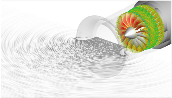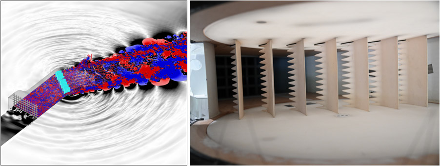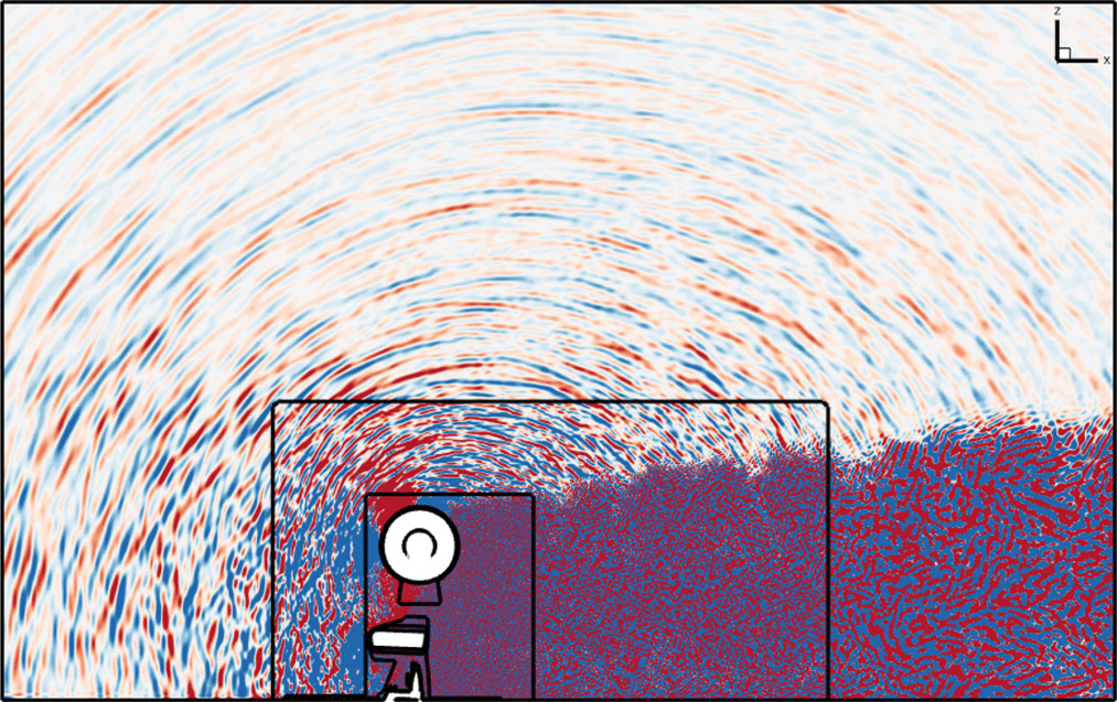 L’approche numérique repose sur le développement et la mise en œuvre de modèles analytiques ainsi que d’outils et de méthodes adaptés pour la résolution numérique haute-fidélité de problèmes d'aéroacoustique, combinant généralement un calcul d’écoulement instationnaire (génération des sources de bruit) et leur propagation.