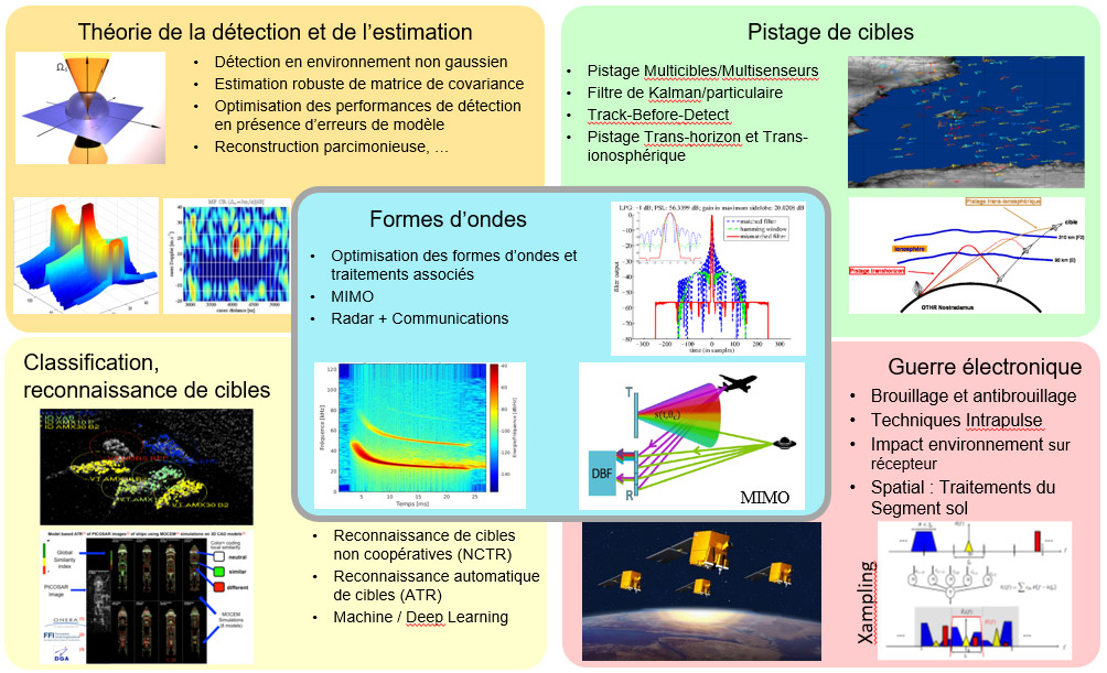 • Optimisation de la gestion radar et des chaînes de traitement du signal (détection, estimation, ...) et de l’information (pistage, reconnaissance, …), et évaluation des performances face à des menaces futures,