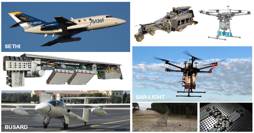 Pour cela, elle met en œuvre des démonstrateurs à bord de différentes plateformes d’essais aéroportés, couvrant des domaines de vols variés permettant des mesures de proximité en courte portée (drone SAR-Light), moyenne et longue portée (moto-planeur BUSARD) et grande portée et grande couverture (avion jet SETHI). Elle embarque à bord de ces plateformes des capteurs innovants aux performances et flexibilités uniques permettant de conduire et soutenir les différents programmes d’étude et recherche en télédétection électromagnétique et imagerie radar appliqués aux domaines civils et défense.